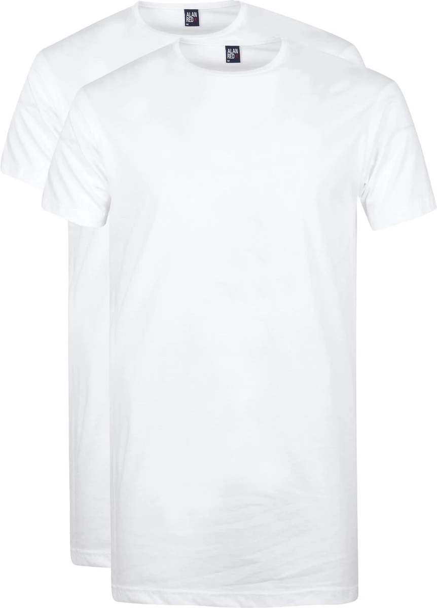2-pack extra lange witte ronde hals T-shirts uit de Derby LONG collectie van Alan Red. Dit model heeft een dunne ronde hals (crew neck). Ze zijn gemaakt van 100% premium katoen. De shirts hebben een rechte, oftewel regular fit pasvorm zodat de shirts comfortabel zitten met genoeg bewegingsvrijheid. De T-shirts hebben korte mouwen en een ronde hals (O-neck), waardoor ze ideaal zijn als ondershirt.
