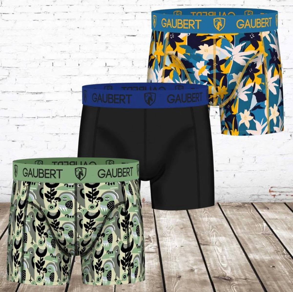 - In een 3-pack met 3 verschillende kleuren: Effen donkerblauw, blauwe print en een groene print