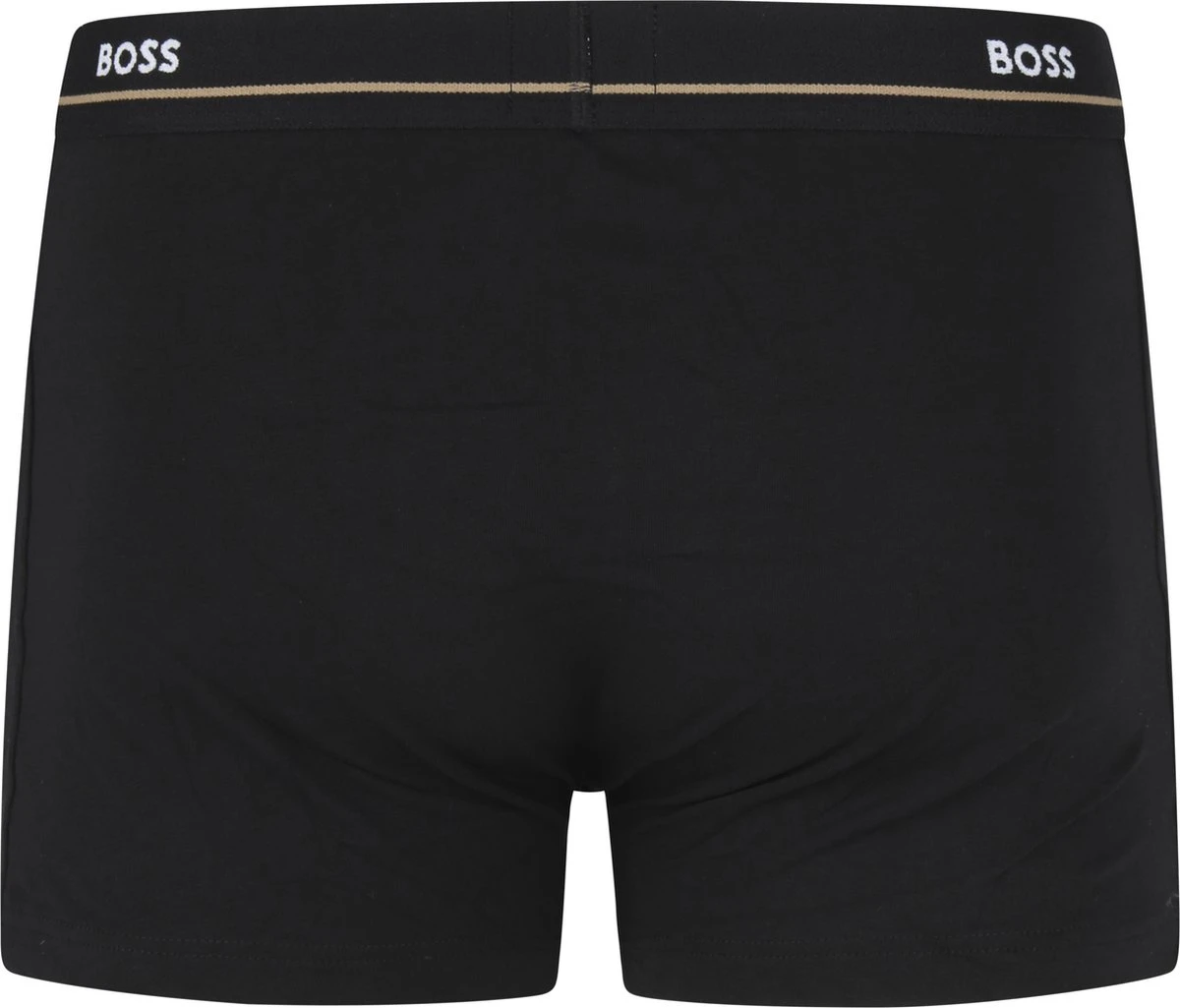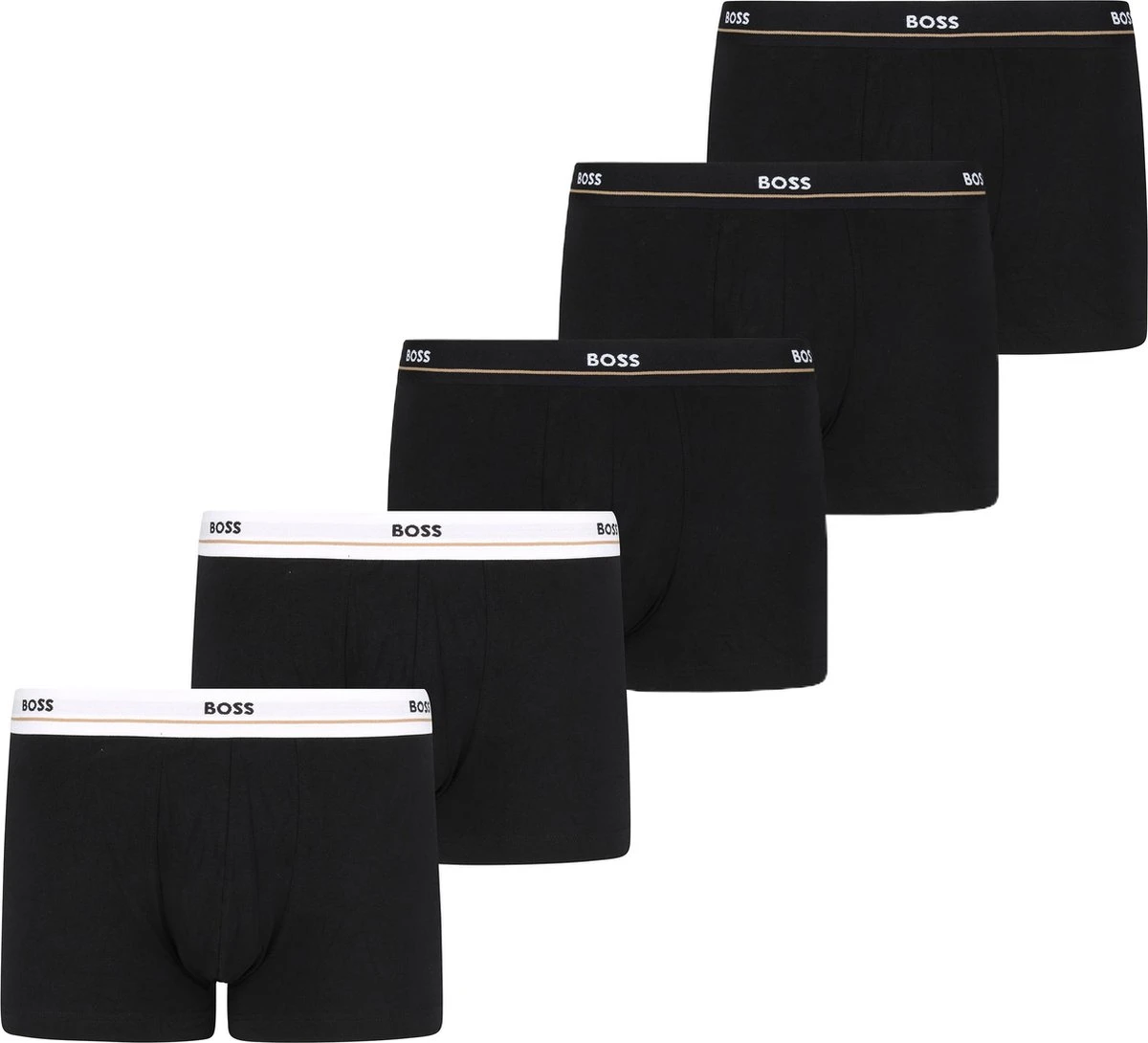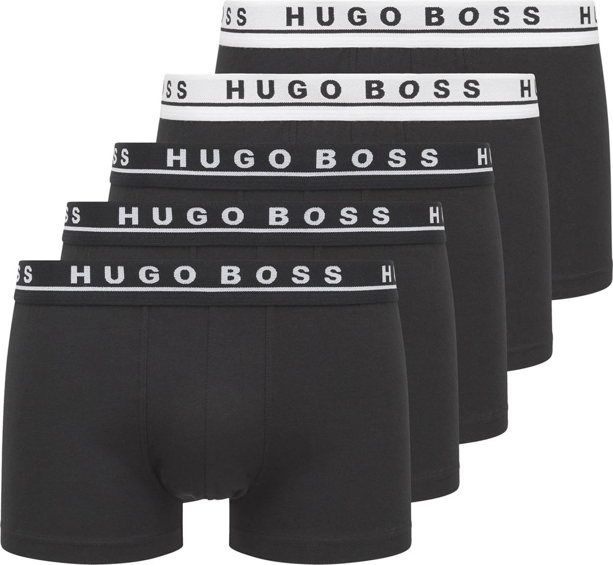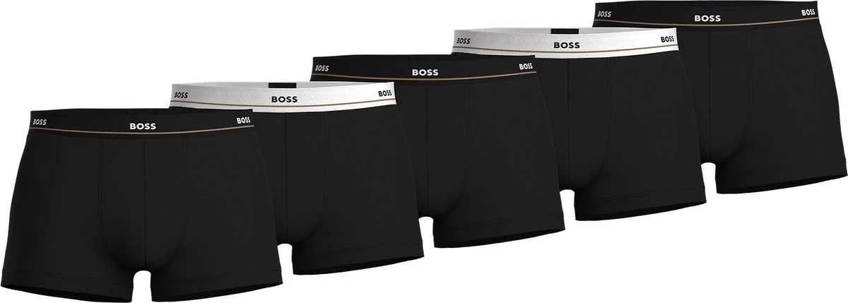 Deze set Hugo Boss boxershorts bevat vijf uni onderbroeken in het zwart. De witte en zwarte elastieke taillebanden van de onderbroeken hebben het herkenbare Hugo Boss logo. Alle onderbroeken zijn gemaakt van 95% katoen, gemengd met 5% elasthaan (stretch). Hierdoor hebben de shorts een zachte en comfortabele touch. Hugo Boss Boxershorts 5-packZwart gekleurdBody-FitGemaakt van 95% katoen en 5% elasthaan (stretch)