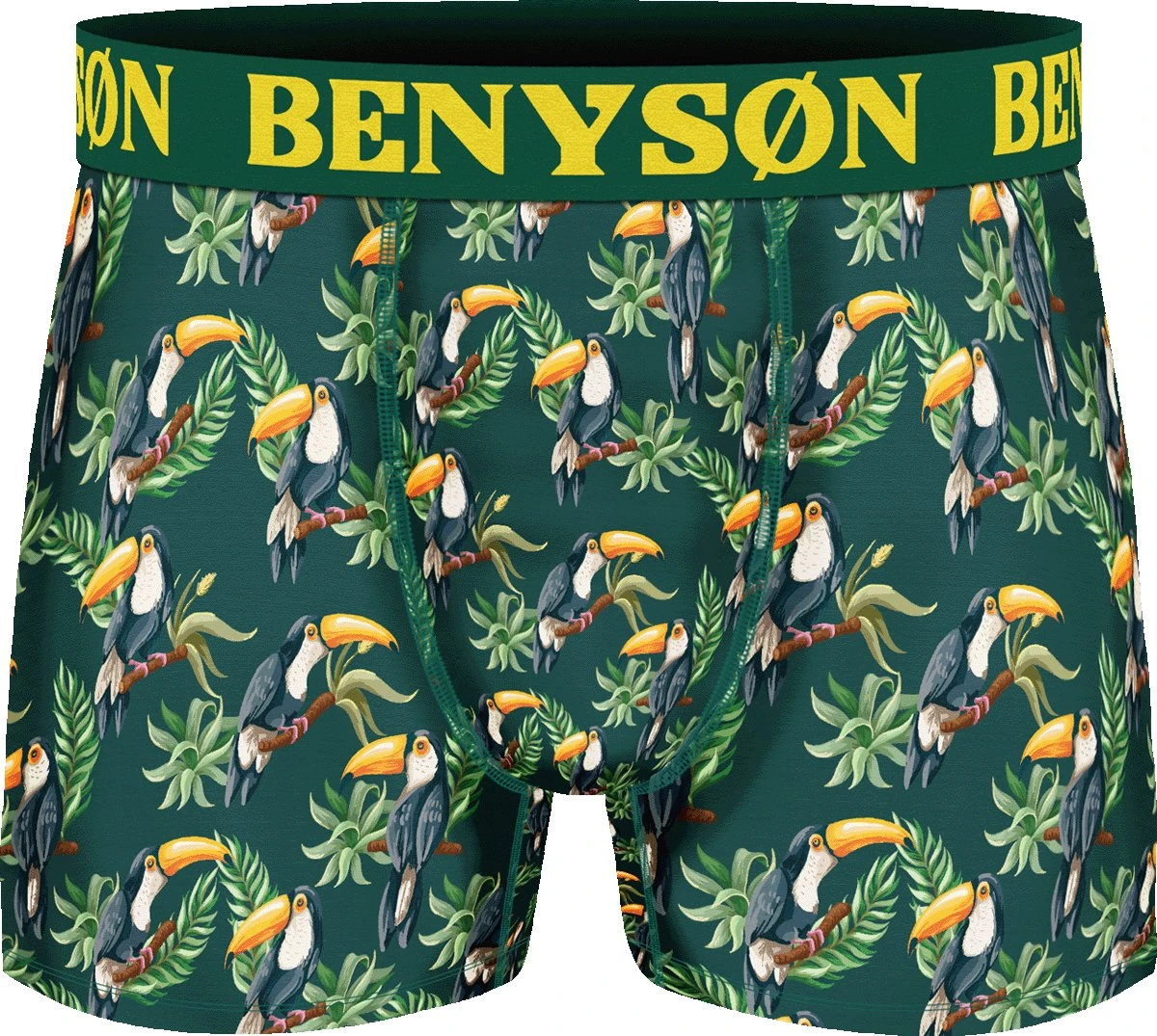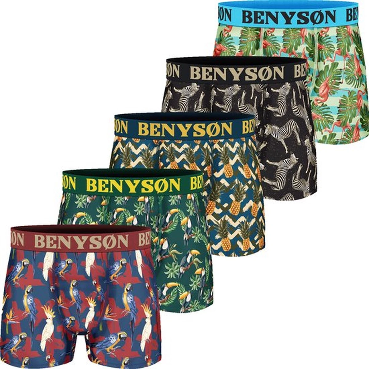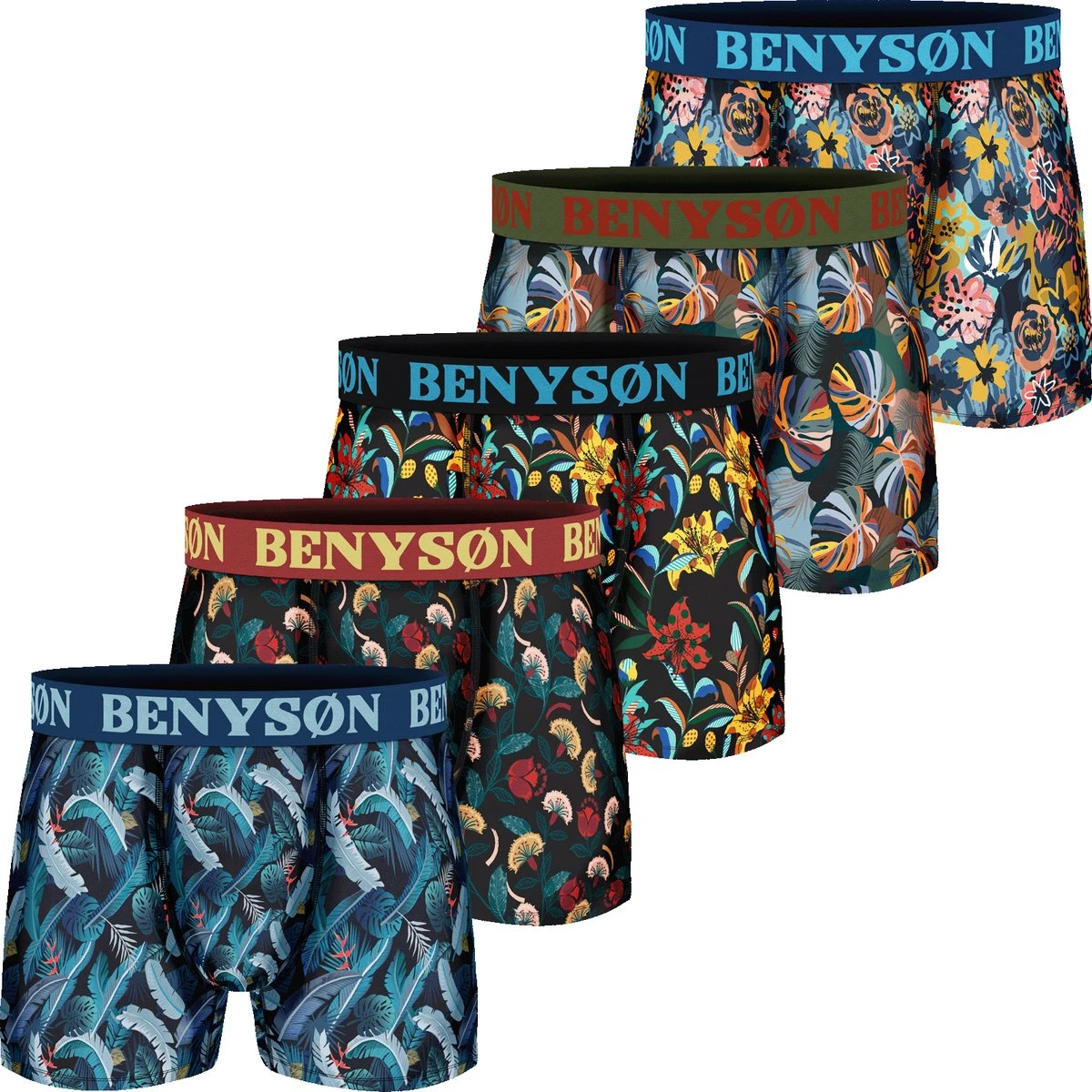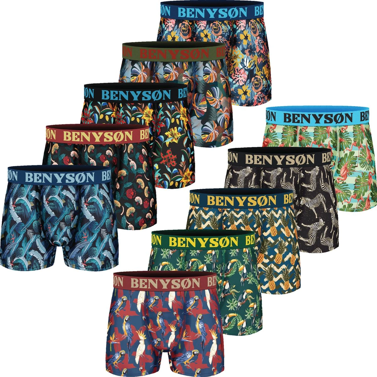 Ervaar het ultieme comfort met de Benyson heren boxershorts, verkrijgbaar in dierenprint en bloemenprint. Deze boxershorts zijn gemaakt van hoogwaardig materiaal, waardoor je je de hele dag fris en comfortabel voelt. De boxershorts zijn gemaakt van 60% katoen, 35% viscose en 5% elastaan. Het hoge gehalte viscose zorgt ervoor dat de boxershorts zeer zacht aanvoelen en huidvriendelijk zijn. De stof absorbeert vocht en water goed, waardoor je je altijd droog en comfortabel voelt. Zelfs bij warm weer blijft de stof koel en luchtig aanvoelen, wat zorgt voor een ongekend comfort. De Benyson heren boxershorts hebben een normale pasvorm die goed aansluit op je lichaam. De stof is kleurvast en blijft ook na vele malen wassen er als nieuw uitzien. Dit maakt de boxershorts duurzaam en geschikt voor dagelijks gebruik. Het pakket bevat maar liefst 10 paar boxershorts in de maten M, L, XL en XXL. Dit maakt het pakket zeer geschikt als cadeau voor jezelf of voor een vriend of familielid. De dierenprint en bloemenprint geven de boxershorts een speelse en trendy uitstraling. Ervaar zelf het ultieme comfort van de Benyson heren boxershorts en bestel ze nu!