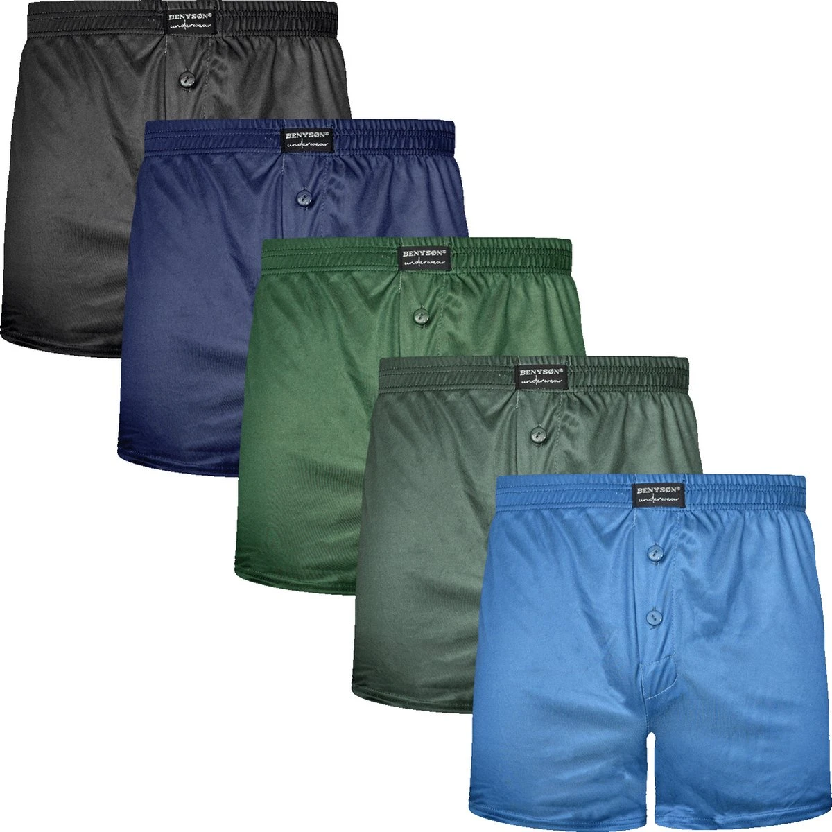 De Benyson heren wijde boxershorts zijn een must-have voor iedereen die op zoek is naar ultiem comfort en bewegingsvrijheid. Deze boxershorts zijn verkrijgbaar in verschillende kleuren, prints en effen kleuren en zijn perfect voor dagelijks gebruik. De boxershorts zijn gemaakt van geweven katoen en hebben een hoog gehalte viscose, wat zorgt voor een superzachte en ademende stof die de hele dag comfortabel blijft aanvoelen. De stof absorbeert vocht en water goed en blijft bij warm weer koel en luchtig aanvoelen, waardoor je je fris en comfortabel voelt, zelfs tijdens de warmste dagen. De tailleband van de Benyson heren wijde boxershorts is voorzien van ruches en elastiek, wat irritatie en knelling voorkomt en ervoor zorgt dat de boxershorts perfect blijven zitten, hoeveel je ook beweegt. De eenvoudige knoopsluiting zorgt voor extra gemak en comfort. De boxershorts hebben een normale pasvorm en zijn verkrijgbaar in maten M, L, XL, XXL en 3XL. Het pakket bevat vijf paar boxershorts in verschillende kleuren en prints, waardoor je altijd een stijlvolle optie hebt om te dragen. Het Benyson label op de voorkant van de tailleband zorgt voor een stijlvolle uitstraling en benadrukt de kwaliteit van de boxershorts. De kleur blijft goed behouden, zelfs na vele malen wassen, waardoor deze boxershorts een duurzame keuze zijn voor dagelijks gebruik. Voeg de Benyson heren wijde boxershorts toe aan je garderobe en ervaar het comfort en de bewegingsvrijheid die je verdient. Bestel nu en geniet van ultiem comfort!
