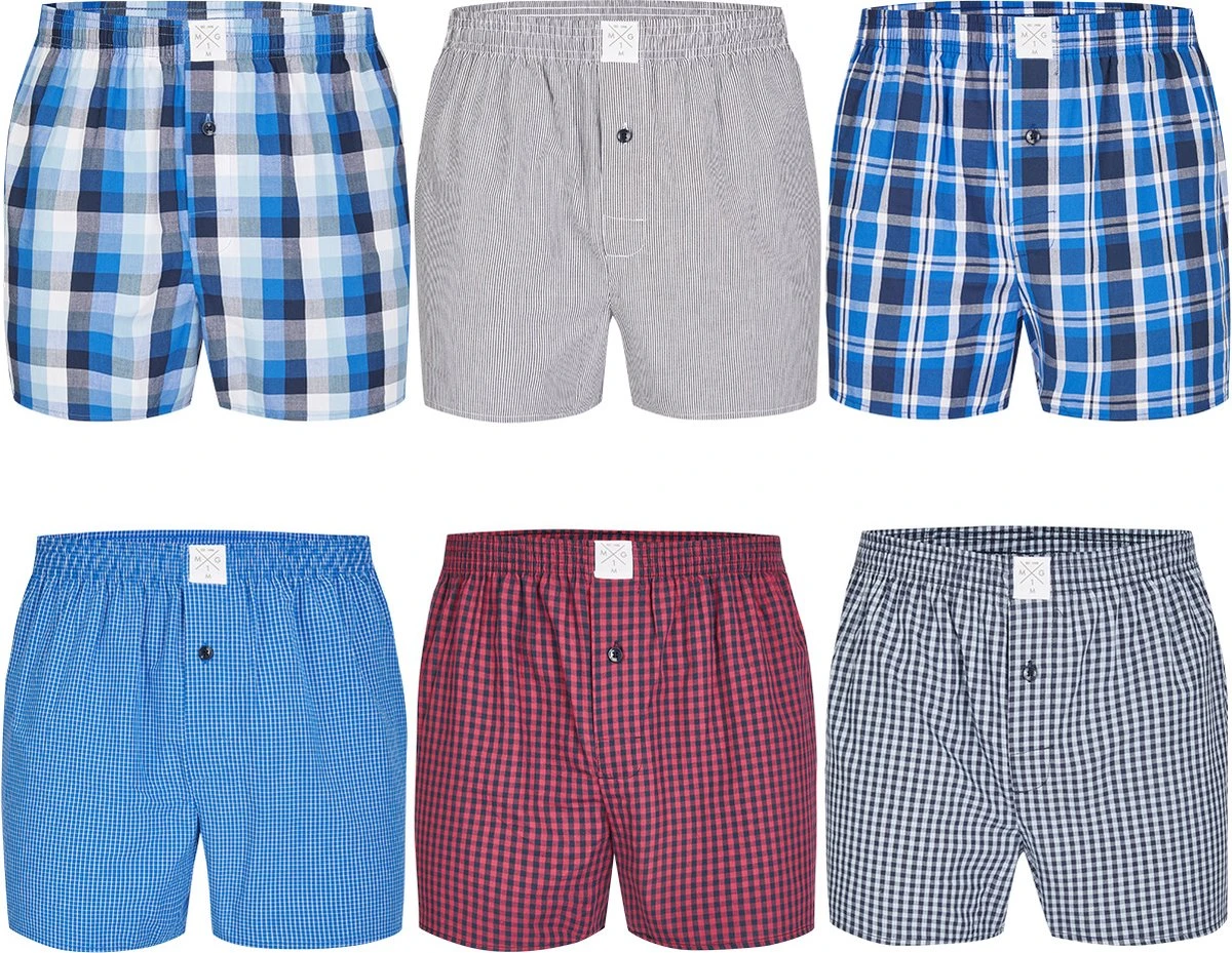 Comfortabele wijde, losse boxershorts van het merk MG-1 gemaakt van 100% katoen. De shorts zijn los en wijd, voorzien van gulp met knoopsluiting. De zeer elastische maar zachte tailleband zorgt voor weinig druk en is comfortabel om te dragen. De set bevat zes boxershorts in zes unieke prints. Geblokt, geruit en gestreept.