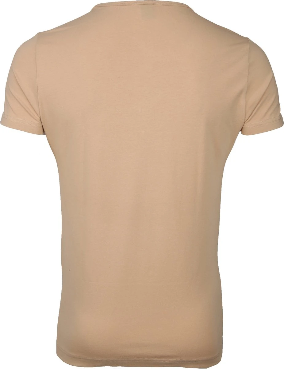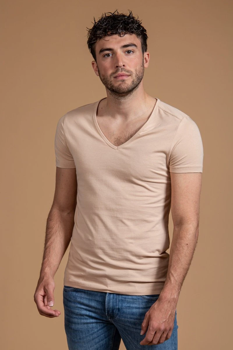 Set van 2 beige, basic T-shirts met extra diepe V-hals. Deze beige huidskleur T-shirts met extra diepe V-hals van ons eigen Door de invisible khaki huidskleur zijn de contouren van het ondershirt onzichtbaar. Draag de herenshirts bijvoorbeeld onder je overhemd of trui voor extra warmte en comfort. Dankzij de diepe V-hals uitsnede kunt u gemakkelijk de bovenste twee knoopjes van je overhemd open dragen. De getailleerde Slim-Fit pasvorm zorgt ervoor dat het beige T-shirt erg lekker een mooi aangesloten zit en dat je ze dagelijks met veel plezier kunt dragen. De shirts zitten verpakt in een duoverpakking van 2 stuks en zijn volledig gemaakt van fijn gekamde, biologische katoen, gemixt met 5% elastaan (stretch). De shirts zijn gemaakt van 175 grams katoen en zijn bewerkt met een Soft Silk Finish, waardoor de stof heerlijk zacht en glad aanvoelt. De korte mouwen zijn voorzien van een gezoomde afwerking. De boord heeft een mooie, smalle boord van 11mm. Set van 2 beige Vitaru T-shirts Met extra diepe V-hals Gemaakt van biologisch katoen met stretch Getailleerde Slim-Fit pasvorm Bewerkt met een Soft Silk FinishBetter Cotton Initiative (BCI) gecertificeerd product