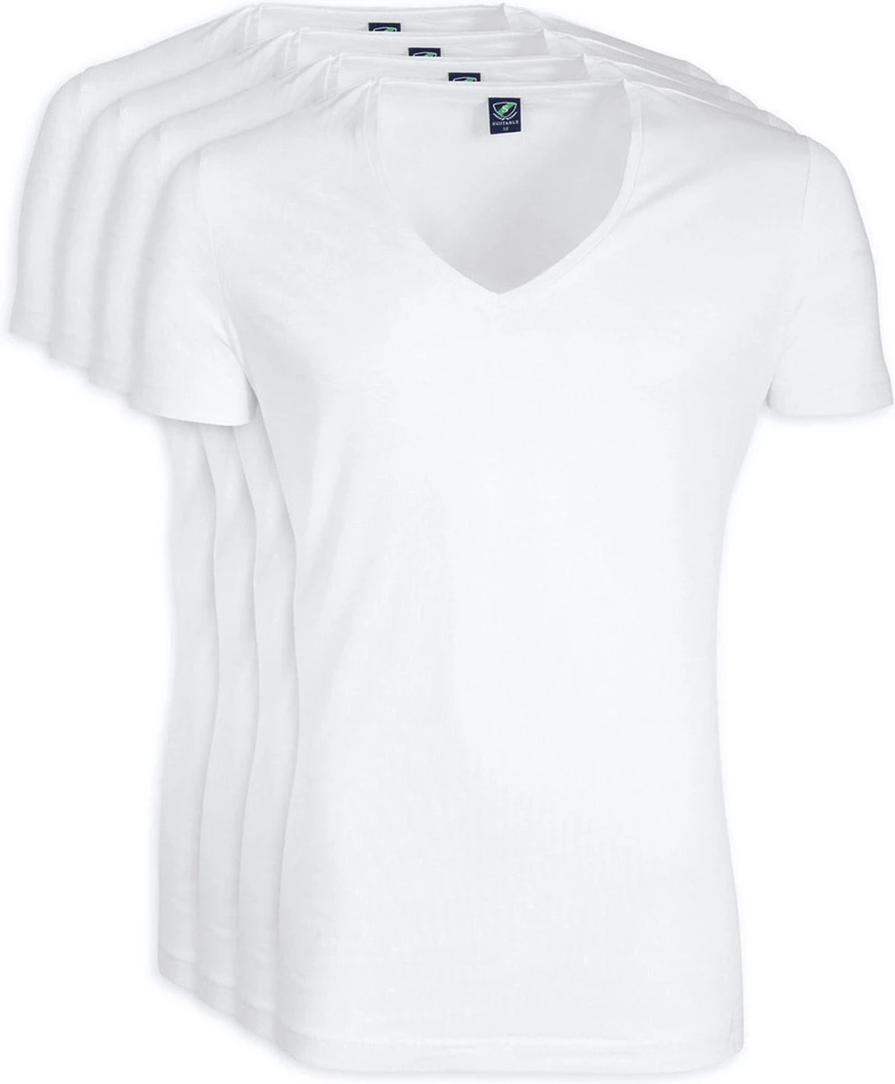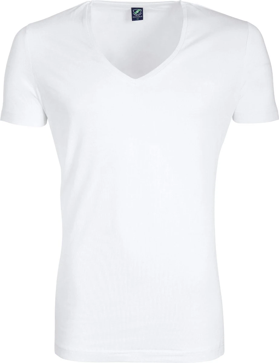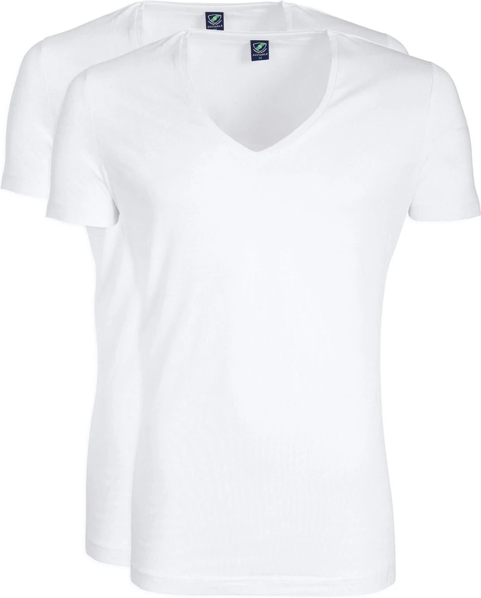 Set van 2 witte, basic Bamboe T-shirts met extra diepe V-hals. Deze witte Bamboe T-shirts met extra diepe V-hals van ons eigen Suitable label zijn de perfecte basis voor jouw garderobe. Als je kiest voor dit T-shirt in een prachtige luxe kwaliteit Bamboe/Katoen, dan kies je voor een zachte, luchtige en soepele stof, die veel minder plakt aan je huid bij warme dagen. Werkelijk een genot om te dragen, zeker als je gevoelig bent voor huidirritaties. Dit Vibamboru T-shirt heeft een Slim-Fit pasvorm en valt daardoor getailleerd langs het lichaam. Dankzij de diepe V-hals uitsnede kunt u gemakkelijk de bovenste twee knoopjes van je overhemd open dragen, zonder dat het T-shirt zichtbaar is Set van 2 witte Vibamboru T-shirts Met extra diepe V-hals Gemaakt van 68% Bamboo Viscose, 4% Elastaan (stretch), 28% Katoen Slanke Slim-Fit pasvorm Wasadvies Bamboe textiel is gemaakt van hele fijne vezels, die gevoeliger zijn voor het wassen dan katoen. Een kort fijn wasprogramma, zeker niet hoger dan 40 graden Celsius en maximaal 1400T centrifugeren is al voldoende. Niet langer droger dan “strijkdroog”, en op milde temperatuur strijken. Op deze manier blijft het T-shirt het langst mooi.BamboeBamboe is een zeer snel groeiende, biologisch afbreekbare grassoort, dat zeer milieuvriendelijk wordt verbouwd, zonder dat de bodem wordt aangetast door chemische bestrijdingsmiddelen. Via textielveredeling worden uit deze plant textielvezels vervaardigd. De Bamboe soort, dat wordt gebruikt voor textiel, is niet dezelfde als de Bamboe die op het voorkeursmenu staat van de Pandabeer. Let op:Doordat het bamboe textiel zal reageren op de eerste wasbeurt hebben we hier met de productie al rekening mee gehouden. De T-shirts kun je in de maat bestellen die je gewend bent maar zal net wat groter vallen dan normaal. Na de eerste wasbeurt krimpt de fijne bamboe vezels enkele procenten en zal daarna de juiste lengte en pasvorm krijgen.